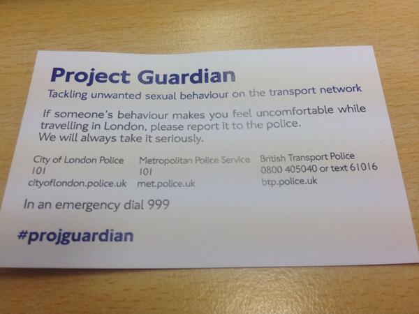 RT @jesskue: Just got handed this card outside tube by @metpoliceuk to combat @EverydaySexism. Stellar work by #projguardian! http://t.co/mDRQkedNeB